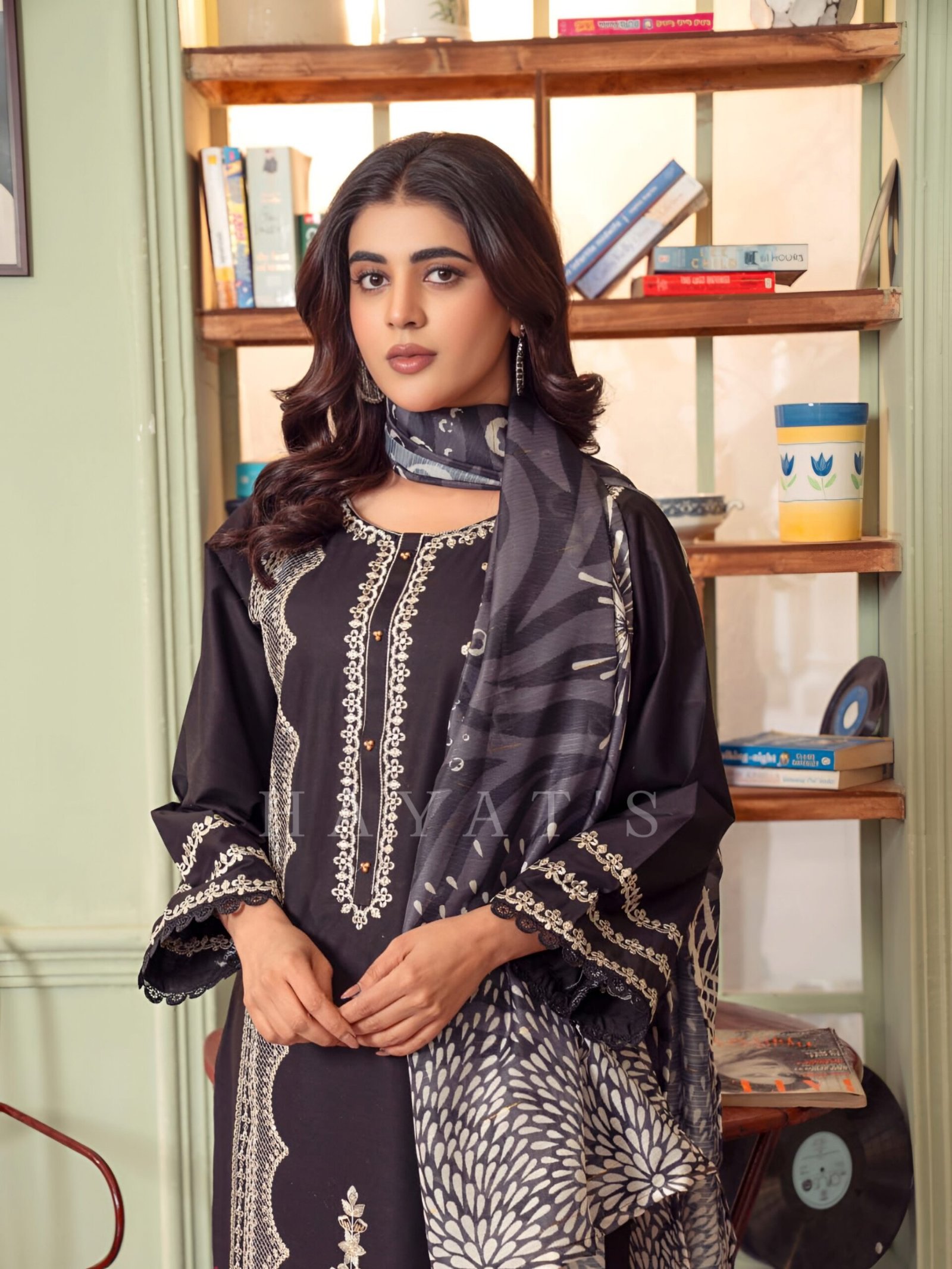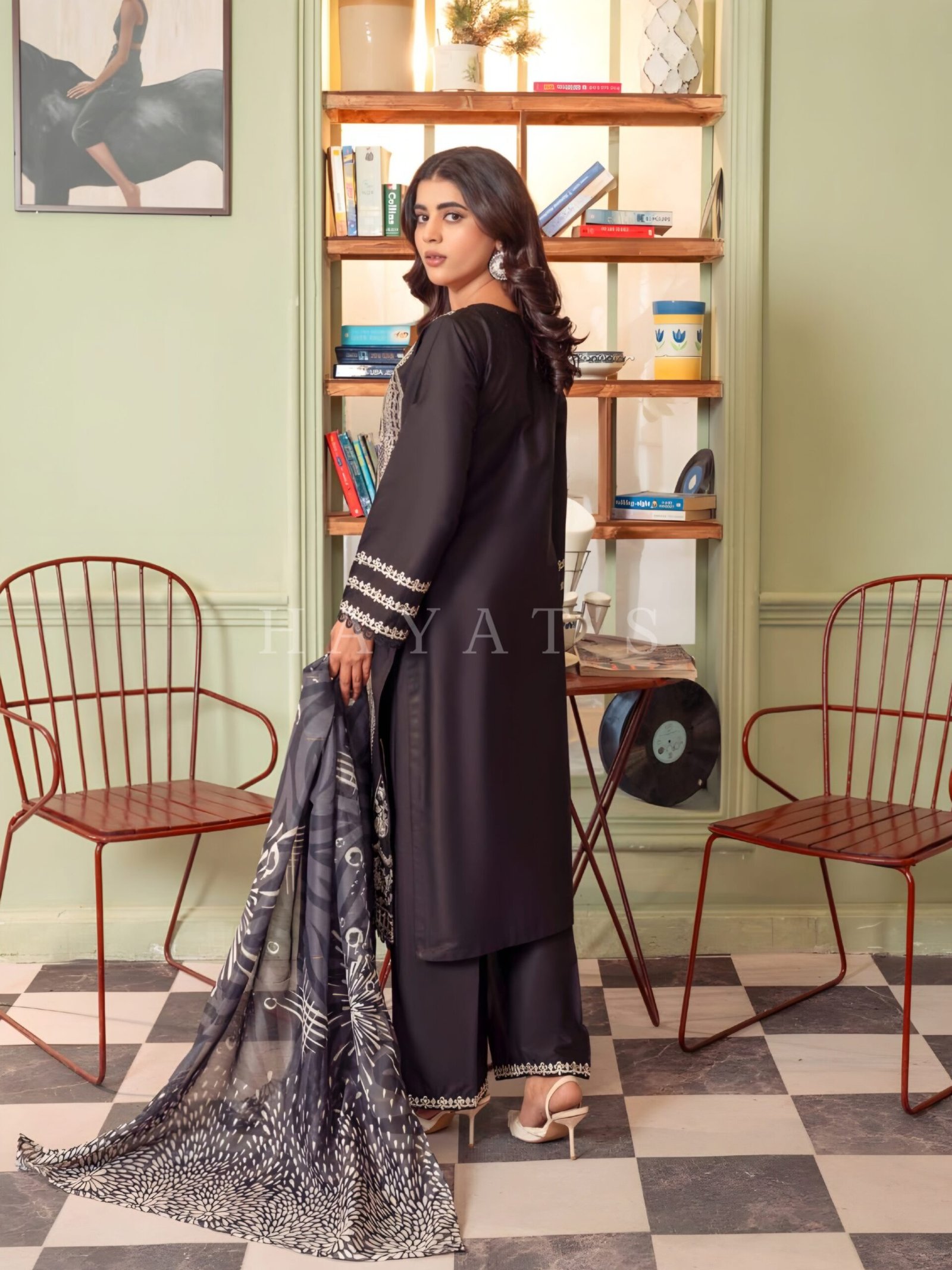 Dupatta: Statement dupatta with bold architectural prints, adding a high-contrast and luxurious touch to the deep black ensemble.