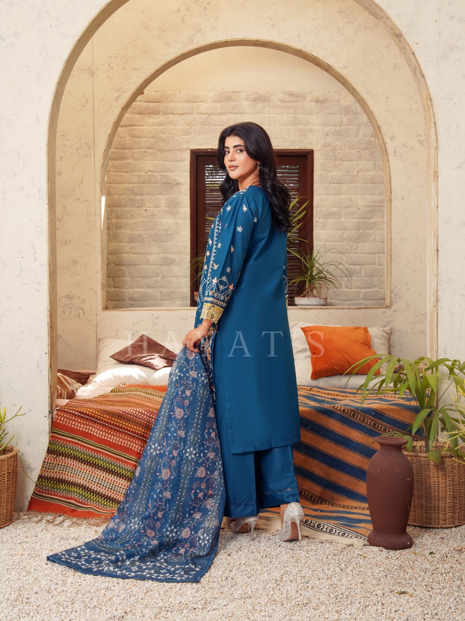 Designed for vibrant elegance, this outfit combines rich Multi-thread embroidery with the traditional shimmer of a Bana Dora Tila Dupatta. The deep jewel tones and high-quality finishing make it the perfect combination of comfort and luxury for your festive wardrobe.