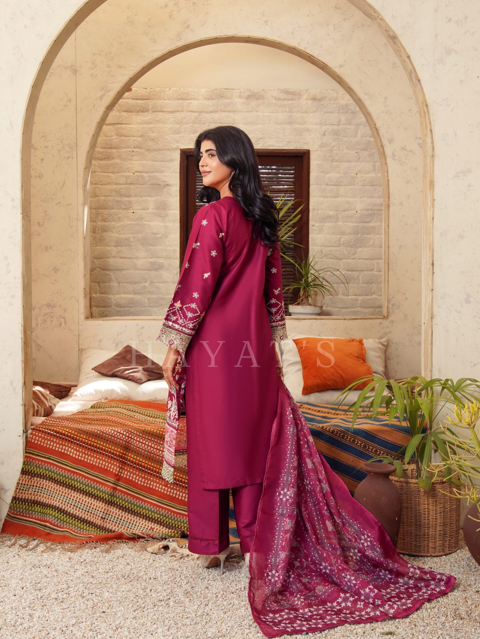 Designed for vibrant elegance, this outfit combines rich Multi-thread embroidery with the traditional shimmer of a Bana Dora Tila Dupatta. The deep jewel tones and high-quality finishing make it the perfect combination of comfort and luxury for your festive wardrobe.