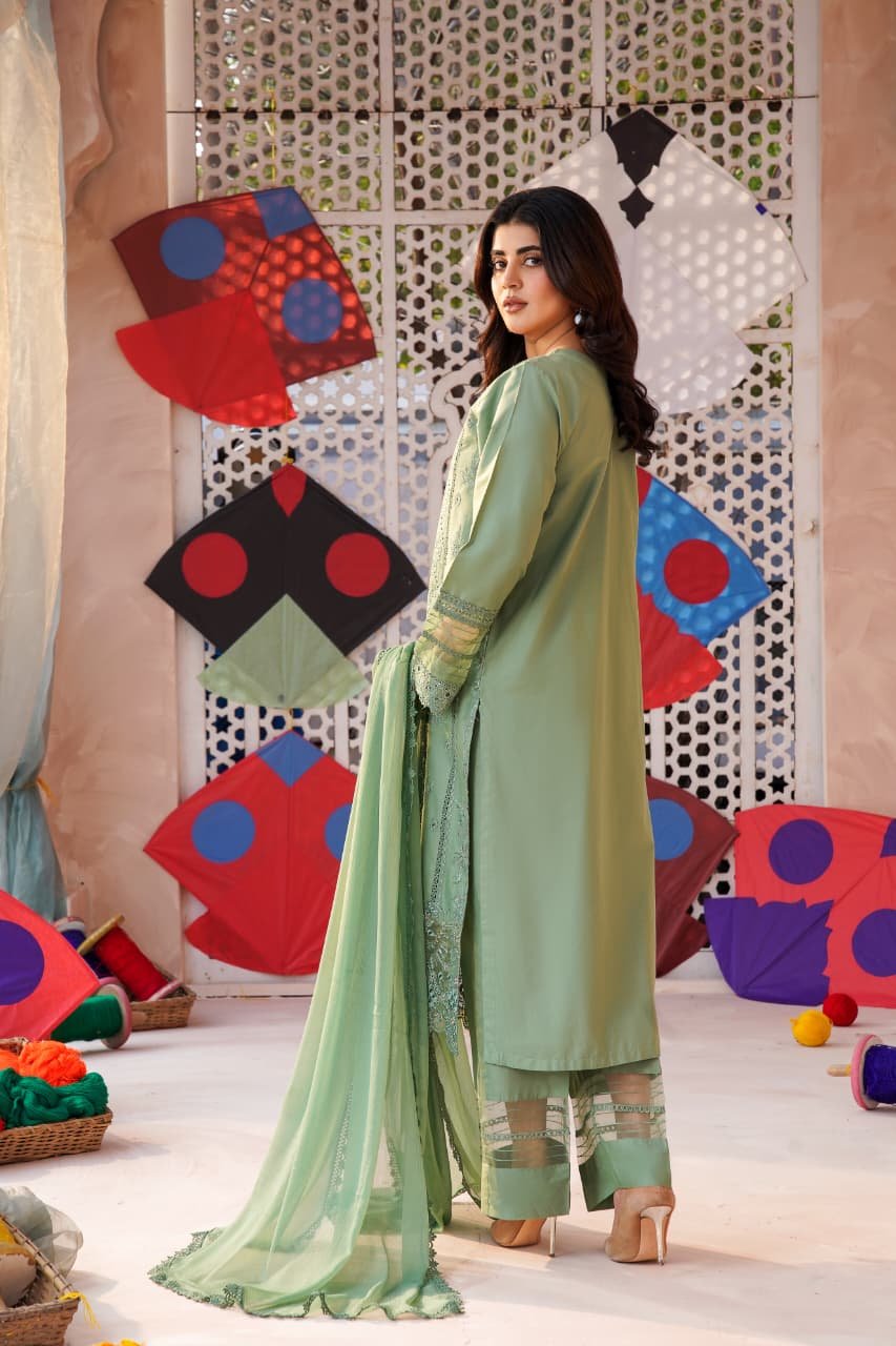 • Dupatta: Crinkle chiffon dupatta with all-around four-side milky lace embellishment, adding a luxurious and feminine finish